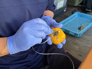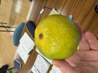 植え替えをした早生ミカンの摘果で、もちかえってきて一個。