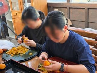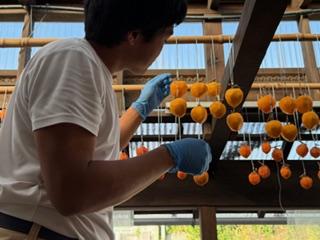 柿のヘタをとって、皮を剥き、消毒をして吊るします。