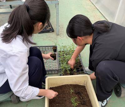 トマトの苗のつぎきの練習をしています。